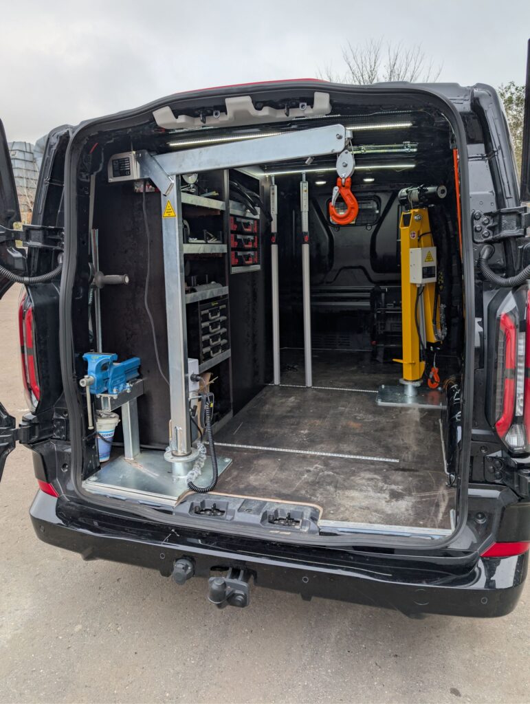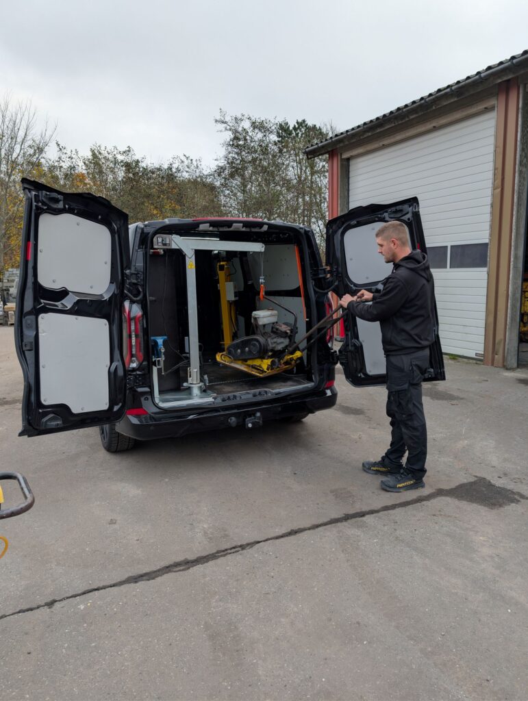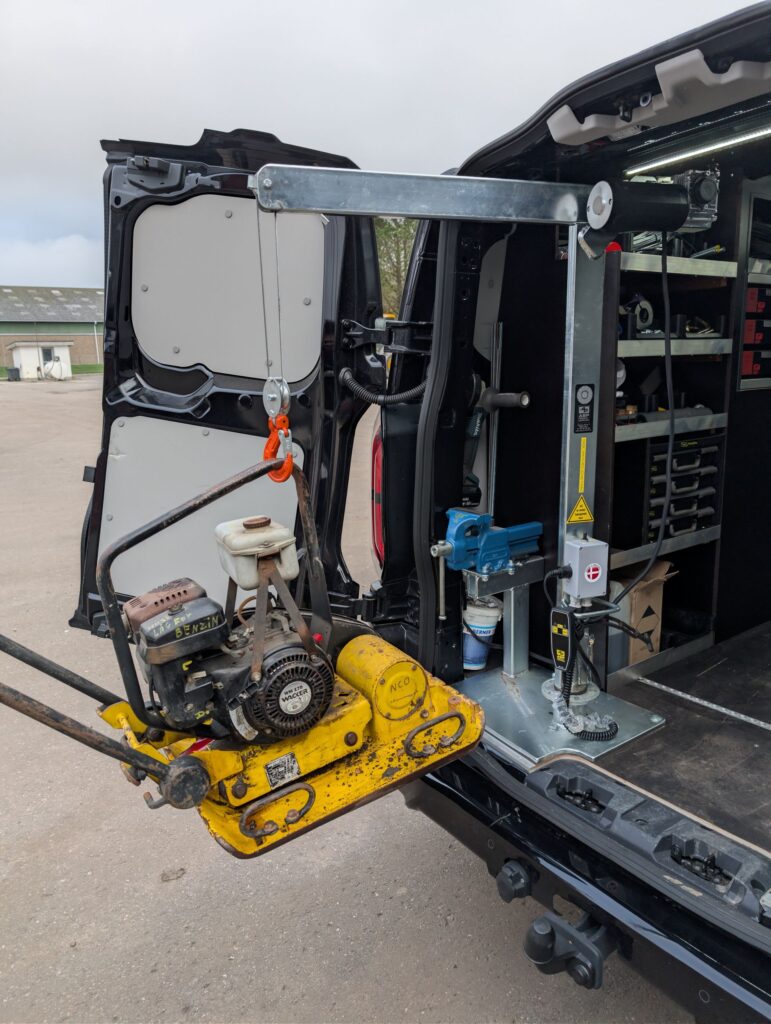 Kranen bruger vi dagligt til løft af maskiner og værktøj ind og ud af servicebilen, hvor den bidrager til en mere effektiv og ergonomisk arbejdsdag.