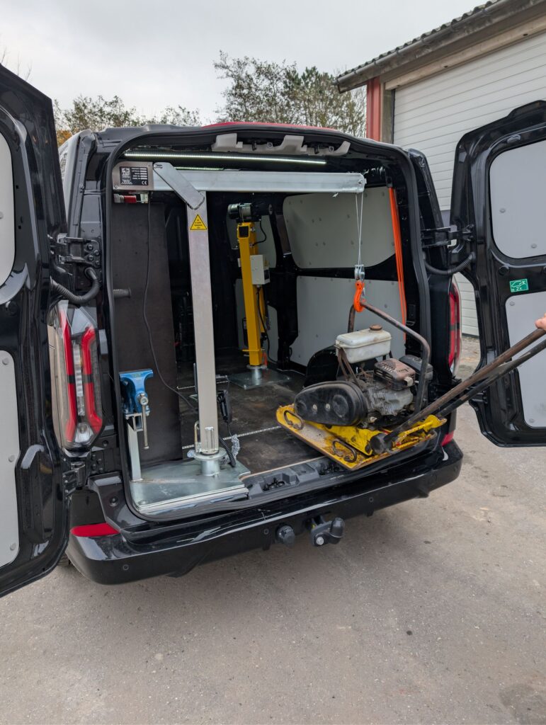En kran i varebil behøver ikke fylde meget for at gøre en stor forskel i hverdagen. I vores egen servicebil, en Ford Transit Custom, har vi monteret en Knap On Kran Sammenklappelig med en løftekapacitet på 220 kg.