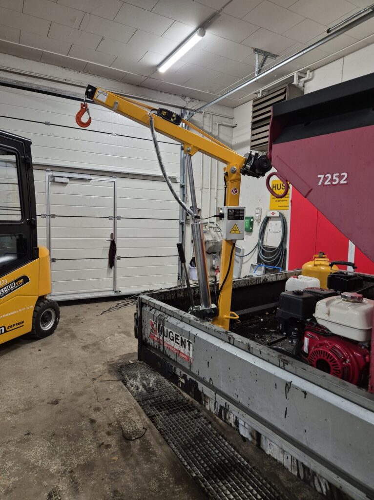 Den valgte løsning er en Knap On Kran håndhydraulisk med elektrisk wirehejs og manuelt udskud. Kranen har en løftekapacitet på 350 kg og et udskud, der rækker op til 1,5 meter.