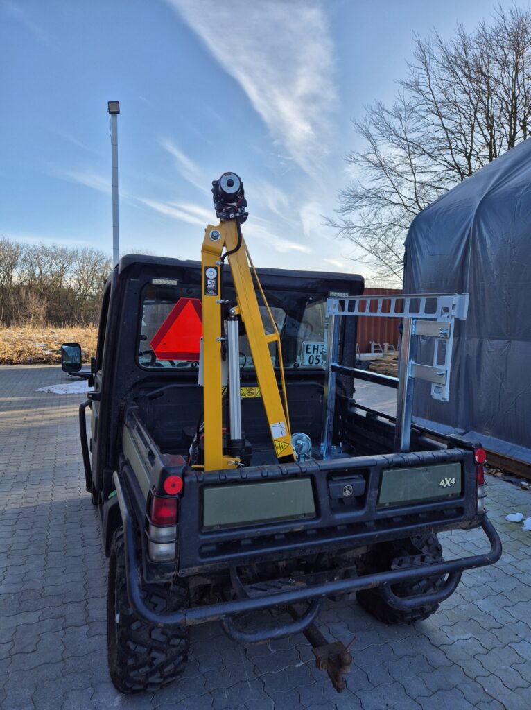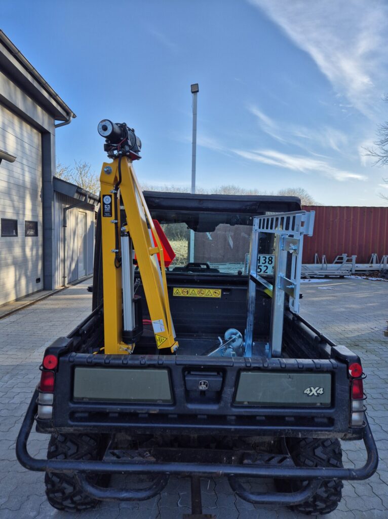 ASP udviklede en komplet specialløsning baseret på vores Knap On Kran med fuldt elektrisk løft, elektrisk udskud og wirehejs. Løsningen blev monteret på en John Deere UTV med en robust ankerplade og et beslag til ophæng af emner på ladet under transport.