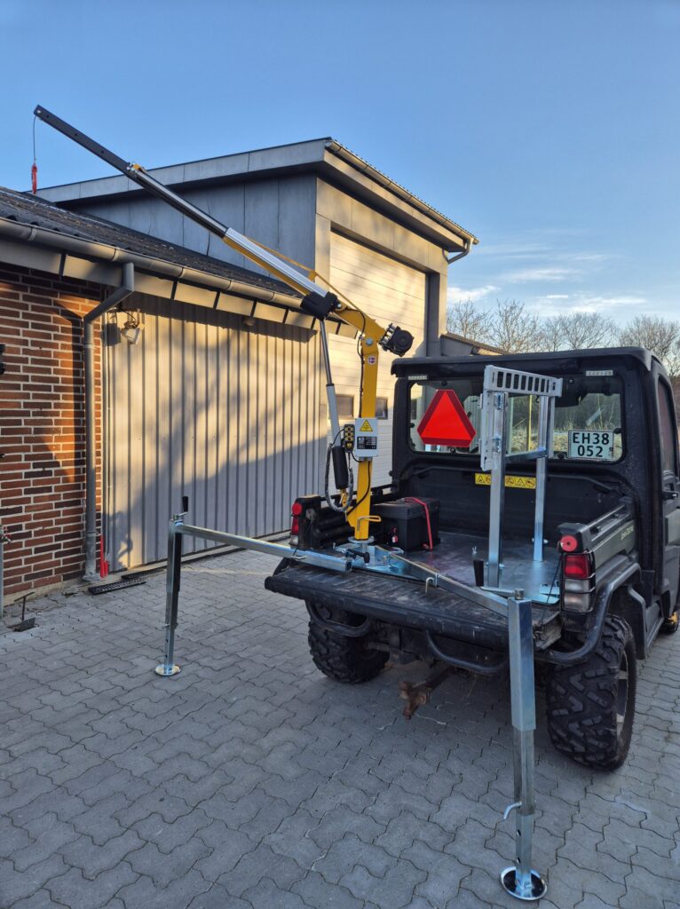 For at sikre stabilitet i terrænet konstruerede vi to svingbare og justerbare støtteben, som kan tilpasses det konkrete løft og underlaget. Kranen drives af et aftageligt batteri, hvilket eliminerer behovet for at holde UTV’en i tomgang og samtidig giver mulighed for at flytte kranen til andre køretøjer eller trailere, hvor der er monteret samme type bundplade.