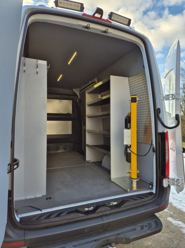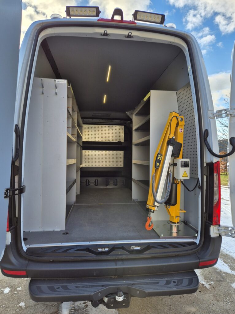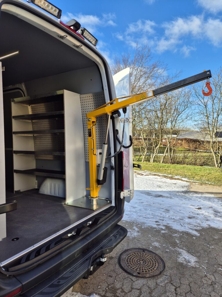 I denne case har vi monteret en Knap On Kran Elektrisk Løft med elektrisk udskud og fastmonteret kæde i en ny Mercedes-Benz Sprinter leveret til Kaj Bisgaard ApS.