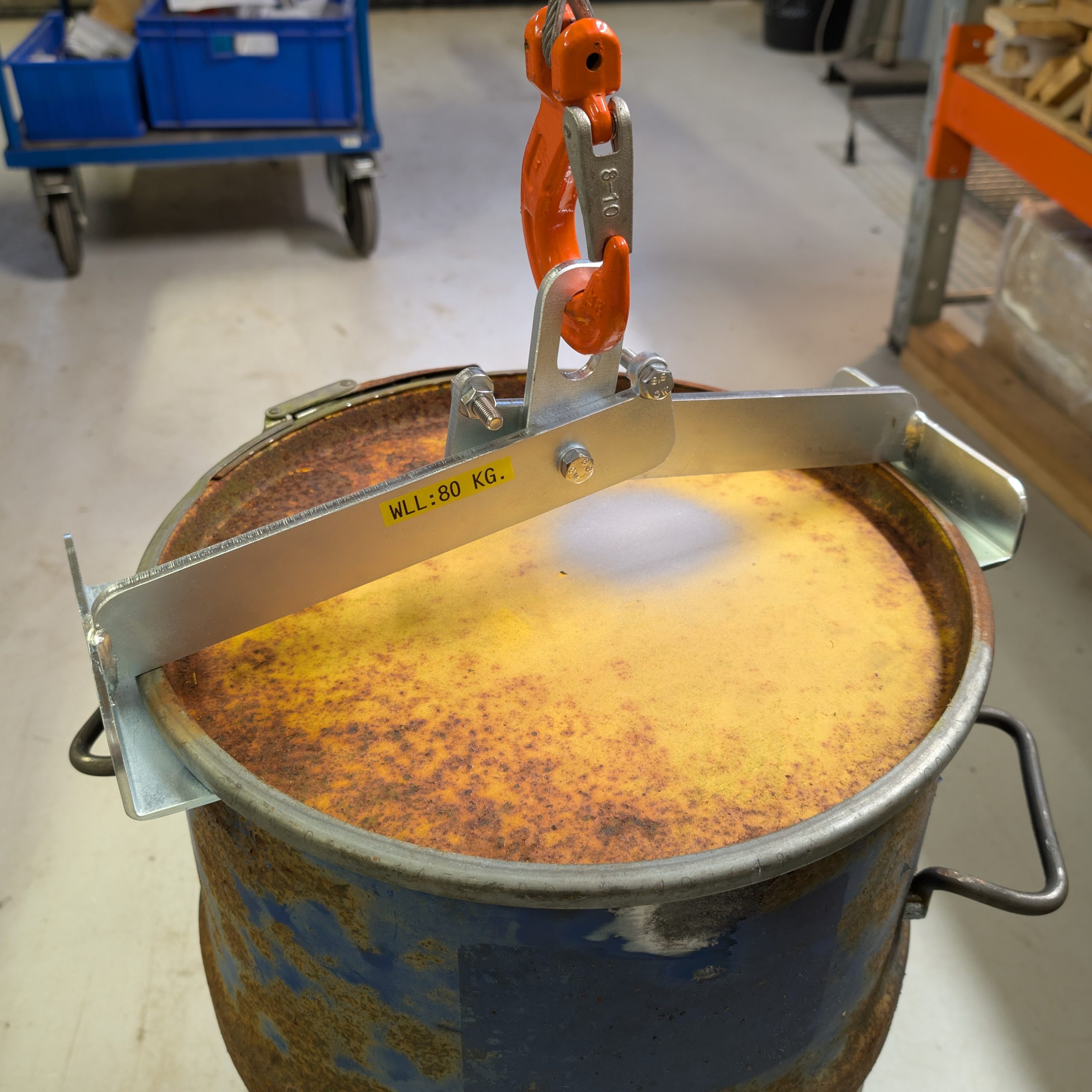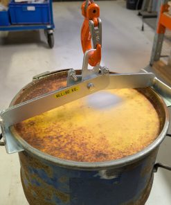 Robust tang til løft af tønder, ideel til montering på en kran, når tunge tønder skal løftes ind og ud af bil eller trailer. Passer til ståltromler med og uden låg på 60 liter.